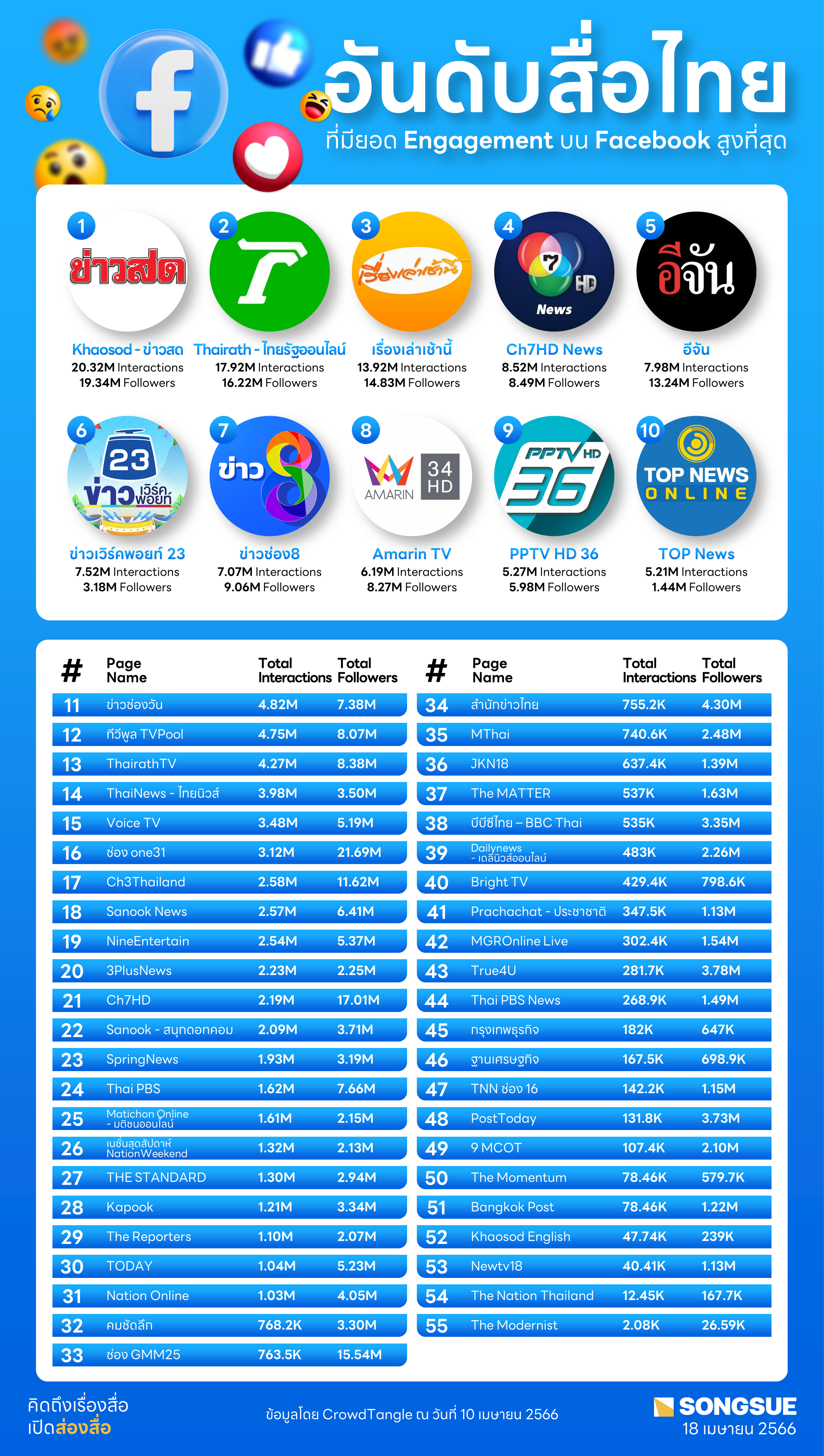 สำหรับยอดเพจที่มี Engagement สูงที่สุดประจำเดือนมีนาคม 2566 ยังคงเป็นข่าวสดที่มียอดรวมอยู่ที่ 20.32 ล้านครั้ง และคนติดตามอยู่ที่ 19.34 ล้านคน ในขณะที่ไทยรัฐออนไลน์ตามติดมาเป็นอันดับที่ 2 ด้วยยอดรวมที่ 17.92 ล้านครั้ง และผู้ติดตามอยู่ที่ 16.22 ล้านคน ส่วนอันดับ 3 คือเรื่องเล่าเช้านี้ มียอดรวมอยู่ที่ 13.92 ล้านครั้ง และผู้ติดตามอยู่ที่ 14.83 ล้านคน รองลงมาคือ Ch7HD News มียอดรวมอยู่ที่ 8.52 ล้านครั้ง และผู้ติดตามอยู่ที่ 8.49 ล้านคน ส่วนอันดับที่ 5 เป็นของอีจัน ที่มียอดรวมอยู่ที่ 7.98 ล้านครั้ง และผู้ติดตามอยู่ที่ 13.24 ล้านคน
